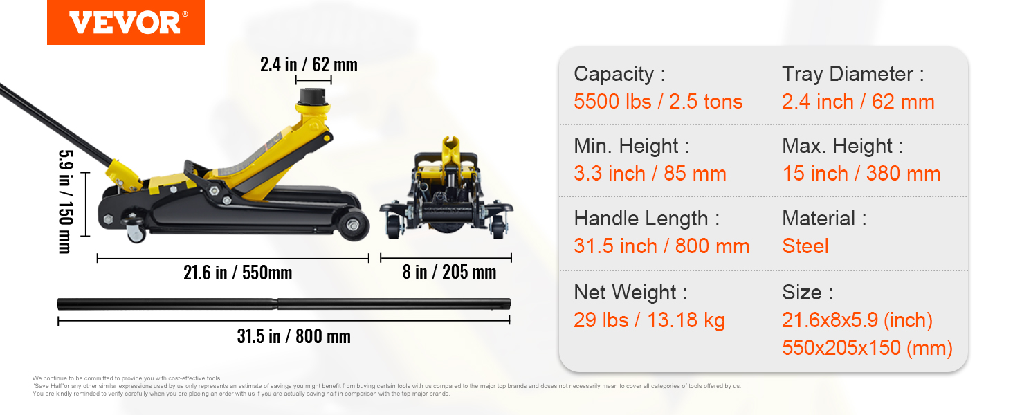 Max. loading capacity: 2.5 ton//4/3/1.5/2.5 ton. Lifting range: 3.35"-14.96"/3.94"-20.98"/3"-19.5"/5.12"-19.7"/3-3/20"- 14-10/27"/ 3-6/11"-19-11/16"/ 3-3/4"-18-7/10"/3"-19.49". Conform to CE, UKCA, ASME. A powerful and reliable floor jack you can trust.