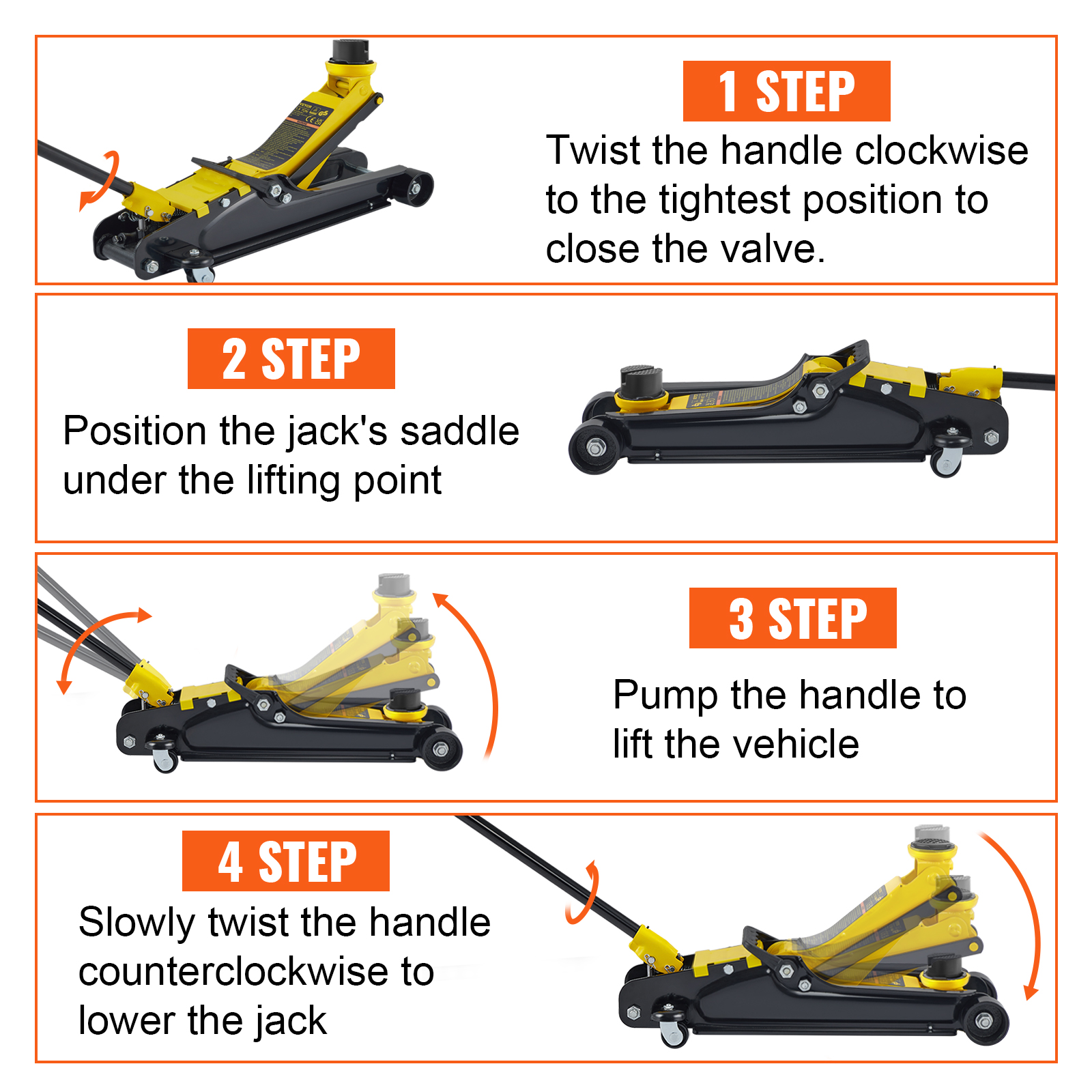 Twist the handle clockwise to the tightest position to close the valve; place the jack's saddle under the lifting point; pump the handle to lift the vehicle. Last, slowly twist the handle counterclockwise to lower the jack.